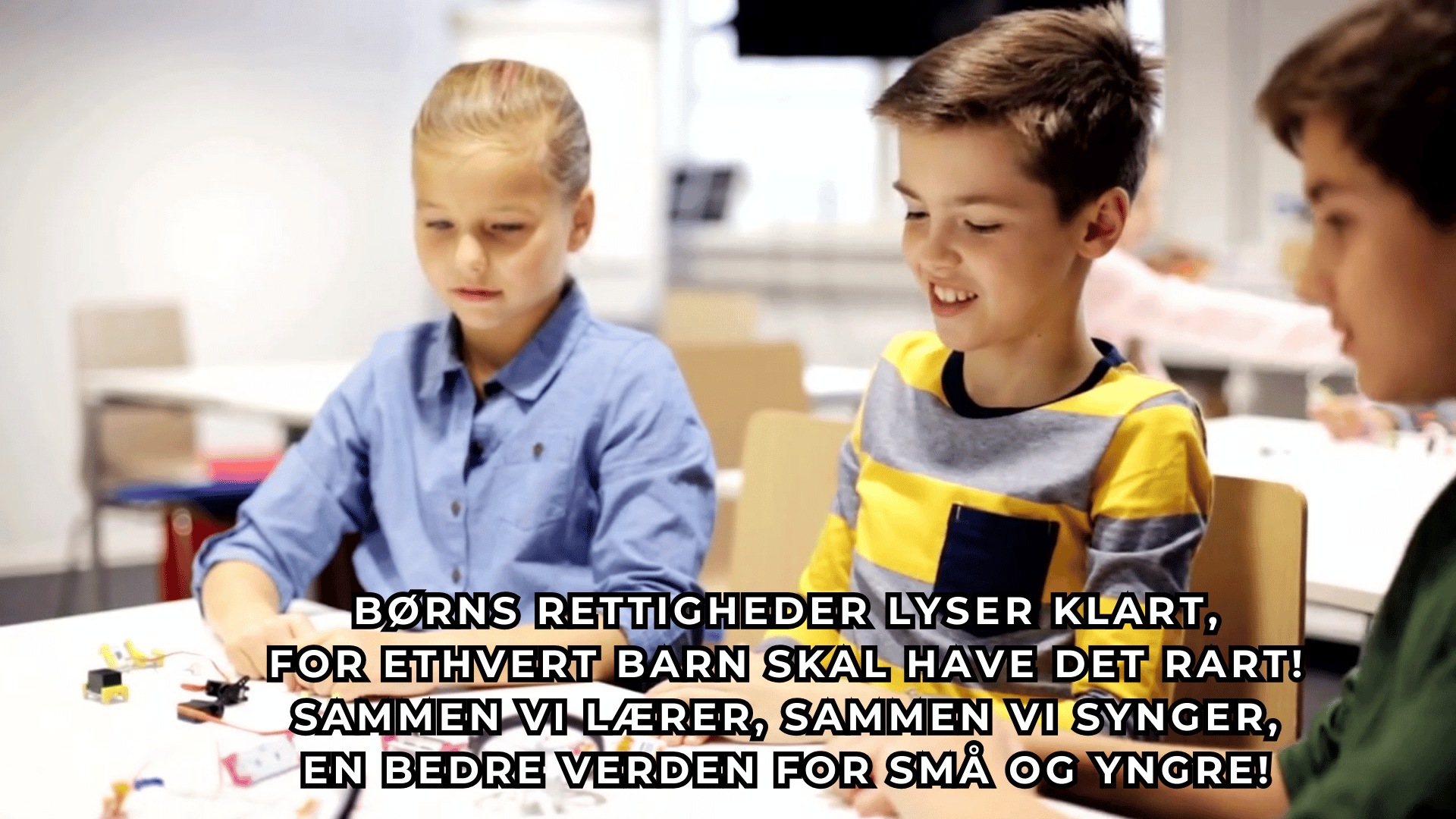 Børns rettigheder lyser klart, For ethvert barn skal have det rart! Sammen vi lærer, sammen vi synger, En bedre verden for små og yngre!